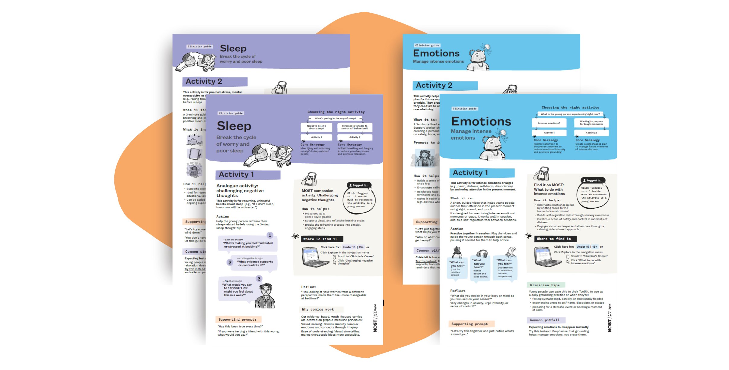 These practical guides are short, evidence-based resources designed for clinicians, by clinicians. Each one features activities you can use immediately, and clear steps on finding relevant resources on MOST.